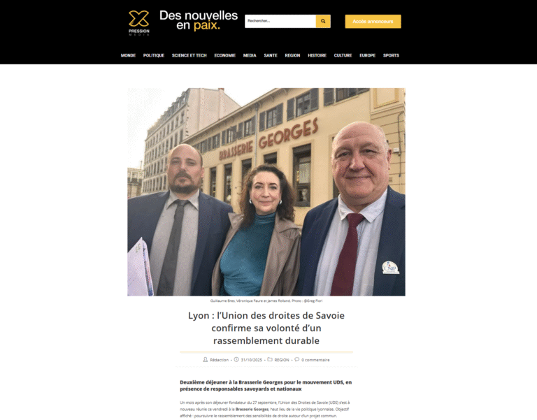 31 octobre 2025 — Lyon. Le média X-pression consacre un deuxième article à l’Union des Droites de Savoie (UDS) après un nouveau déjeuner à la Brasserie Georges. Ce papier revient sur la volonté de rassemblement durable portée par UDS et sur les prochaines étapes de structuration.